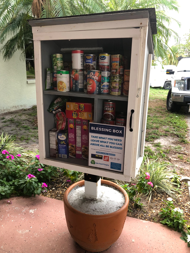 Located under the carport connected to the main building is a “blessing box.” The motto of the “blessing box” is “Take what you need, leave what you can, above all be blessed.” If you come by the church on a day other than Thursday and need food, the blessing box is there for you to take what you need.