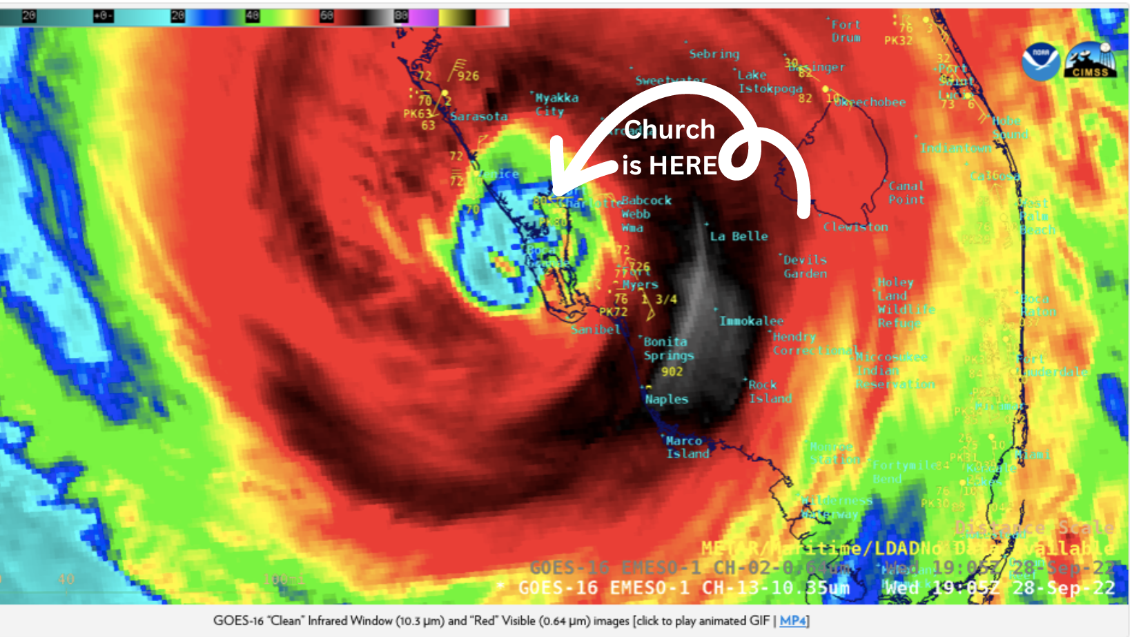 Charlotte County was deeply impacted by Hurricane Ian on Wednesday, September 28, 2022. Living through an almost Category 5 hurricane is an experience like no other. On our property, we lost two pieces of plywood from our roof and because of that, it rained in our sanctuary for over 15 hours. We also had 20 people staying at the church during the hurricane. Many of us believe that the only reason we still have our building intact is because the people who stayed kept doors barricaded from the wind coursing through the entire building. With the wind and water damage to the building, we are currently remodeling the entire sanctuary having to take everything…floor, walls, and ceiling, down to the studs or cement. Our sanctuary is in the rebuilding and remodeling phase and we are excited to see the finished product.